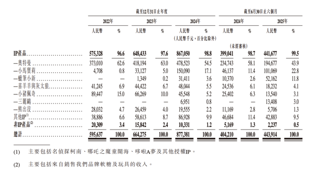 金添动漫的经营业绩虽实现提升,但增长背后也伴随对IP授权的依赖风险。招股书显示,2022年-2024年,金添动漫IP趣玩食品的销售收入占同期总营收的比重分别达96.6%、97.6%、98.8%,2025年上半年进一步增加至99.5%。