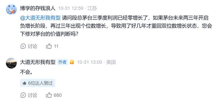 对于该三季报,有网友在雪球上向段永平提问,“请问段总茅台三季度利润已经零增长了,如果茅台未来两三年开启负增长阶段,再过三年出现个位数增长,导致用了好几年才重回双位数增长状态,您会下修对茅台的价值判断吗?”