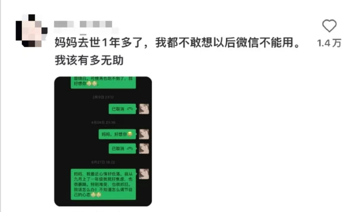 据媒体报道,一名网友的爸爸去世近十年,以前想他的时候会去看看微信聊天记录或者他的朋友圈,最近却找不到爸爸的微信了。这让这名网友觉得崩溃,“哭到停不下来,我和爸爸在世界上的联络彻底消失了。”