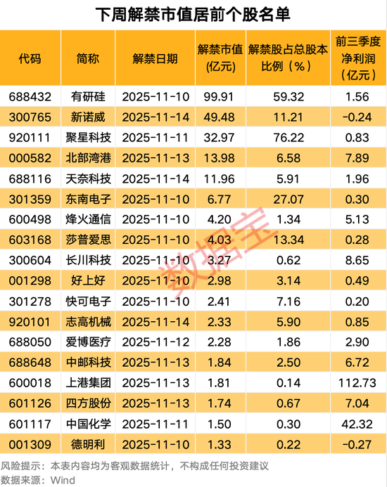 新诺威的解禁规模次之,下周将有1.58亿股上市流通,解禁股主要为定向增发机构配售股份,解禁市值达49.48亿元。