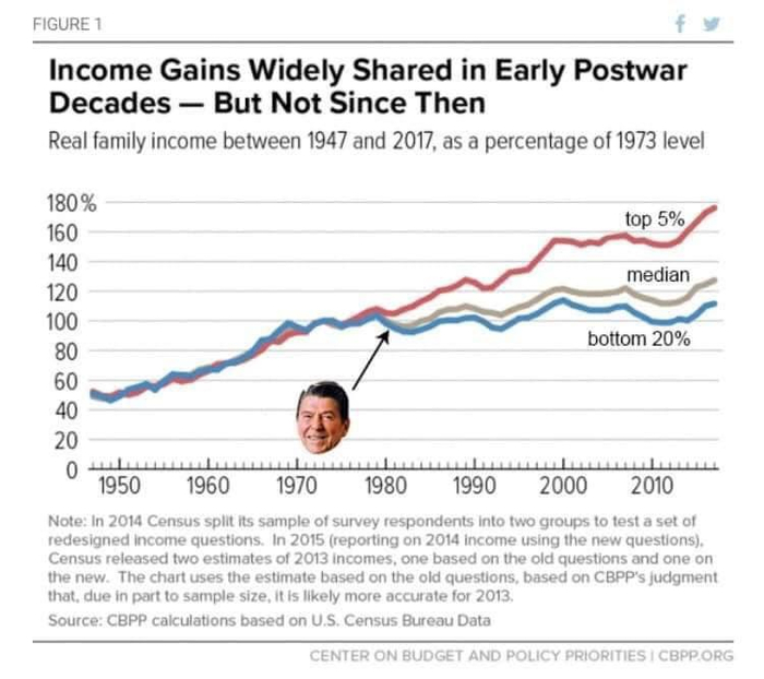 而滞胀得不到解决,就使得反对“凯恩斯主义”的学者和政客的兴起。他们打着“供给学派”的名号,去反对凯恩斯主义的所谓“需求学派”,最终取得了主导地位。而正如我早前的文章所写到的,“供给学派”同样被营销成了一种简单的“减税救一切”的教条,构成了长期主导世界经济政策的“新自由主义”的一部分。