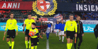 双方球员步入球场,比赛即将打响