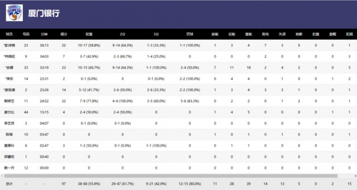 球队方面,厦门白鹭各项投篮命中率都压制对手,厦门白鹭整体投篮命中率达到56%,其中两分球命中率62%,三分球命中率43。在篮板球上,厦门白鹭保持优胜抢到41个篮板,比对方多7个。球员方面,外援安娜发挥出色砍下23分18篮板的大号两双,赖婷艺和彭诗晴都是拿到22分,两人轮番发力帮助球队掌控住局面,谢泼德虽然手感一般,但还是拿到14分,肖婉钰也有7分进账。12月17日,厦门白鹭女篮将在主场再次迎战合肥文旅,希望球队延续势头再度击败对手。