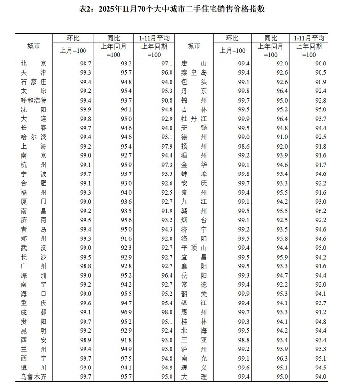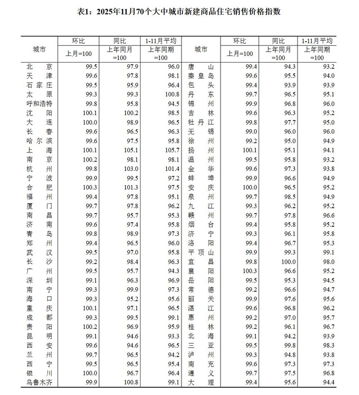2025年11月份,70个大中城市商品住宅销售价格环比总体下降、同比降幅扩大。