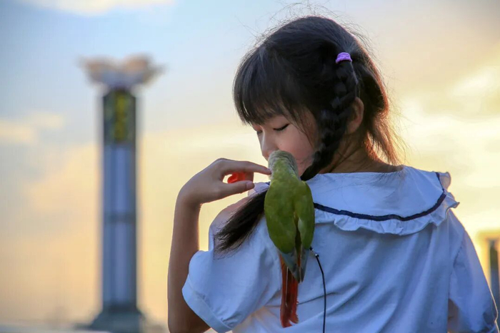 一位小姑娘饲养的宠物鹦鹉趴在她的肩头啄弄着麻花辫子