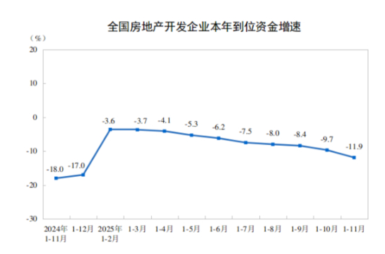 1—11月份,房地产开发企业到位资金85145亿元,同比下降11.9%。其中,国内贷款13149亿元,下降2.5%;利用外资23亿元,下降24.6%;自筹资金30628亿元,下降11.9%;定金及预收款25098亿元,下降15.2%;个人按揭贷款11786亿元,下降15.1%。