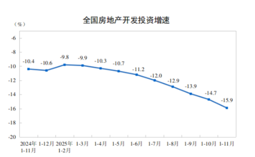 1—11月份,全国房地产开发投资78591亿元,同比下降15.9%(按可比口径计算,详见附注6);其中,住宅投资60432亿元,下降15.0%。