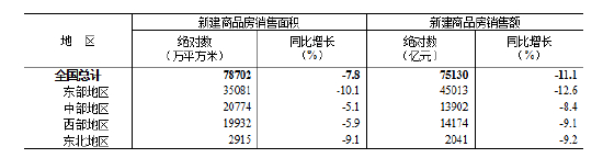 1—11月份,新建商品房销售面积78702万平方米,同比下降7.8%;其中住宅销售面积下降8.1%。新建商品房销售额75130亿元,下降11.1%;其中住宅销售额下降11.2%。