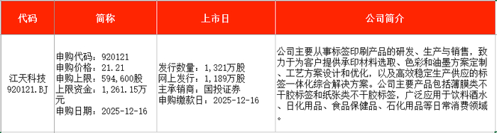 从时间表看,健信超导(688805)将在本周一(12月15日)申购;江天科技(920121)将在本周二(12月16日)申购;誉帆科技(001396)、强一股份(688809)、双欣环保(001369)等均将在本周五(12月19日)申购。