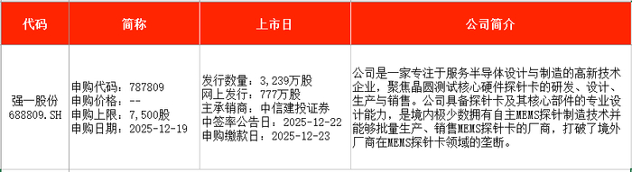 Wind资料显示,强一股份是一家专注于服务半导体设计与制造的高新技术企业,聚焦晶圆测试核心硬件探针卡的研发、设计、生产与销售。公司具备探针卡及其核心部件的专业设计能力,是境内极少数拥有自主MEMS探针制造技术并能够批量生产、销售MEMS探针卡的厂商,打破了境外厂商在MEMS探针卡领域的垄断。