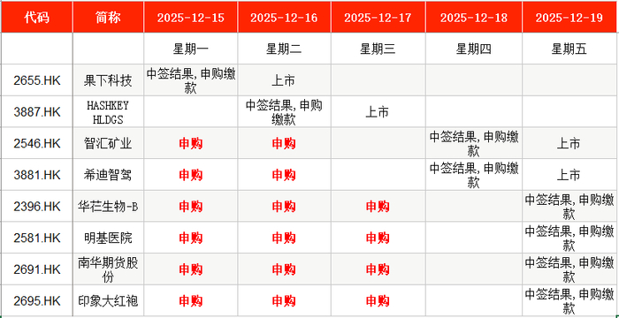 港股方面,Wind数据显示,本周(12月15日至12月19日)智汇矿业(02546.HK)、希迪智驾(03881.HK)均将在周一至周二申购。