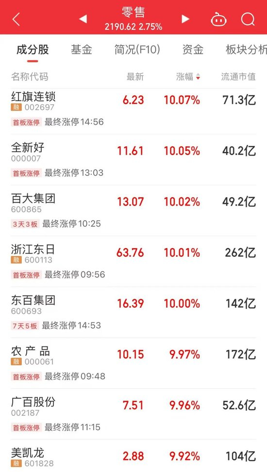 今天,这两大板块继续上涨。具体看,零售板块中,红旗连锁、全新好、百大集团等个股涨停,其中,百大集团迎来3连板