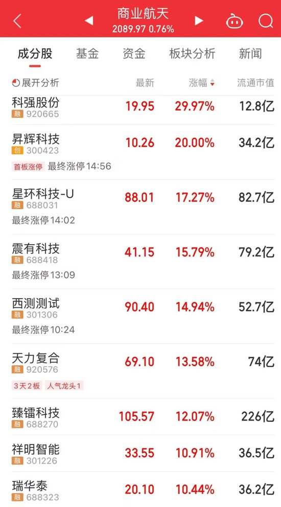 商业航天板块是最近人气最高的板块,今天,航天电子、航天机电、航天信息等热门股掀起涨停潮。此外,多只个股今天盘中股价创出历史新高,如,超捷股份、西部材料、上海瀚讯、斯瑞新材等