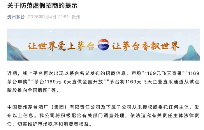 1月4日,贵州茅台通过官方公众号发布《关于防范虚假招商的提示》,明确指出,“1169茅台申购”“茅台1169元飞天直供全国开放”“茅台将1169元飞天企业直采通道从试点阶段推向全国版图”等消息均为虚假招商。