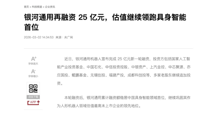 银河通用和松延动力,也很快接住了资本市场的回响:3月初,前者官宣新一轮25亿元融资,后者披露累计近10亿元的B轮融资。