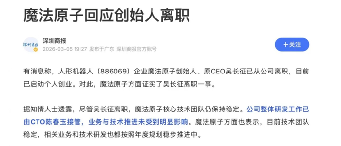 更巧的是,几乎在这条爆料出街的同一时间,才刚和宇树、银河通用和松延动力一起登上春晚的魔法原子,在3月5日被媒体爆出创始人吴长征离职。