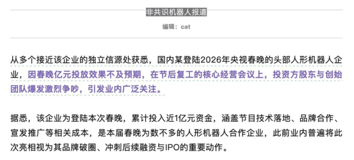 “从多个接近该企业的独立信源处获悉,国内某登陆2026年央视春晚的头部人形机器人企业,因春晚亿元投放效果不及预期,在节后复工的核心经营会议上,投资方股东与创始团队爆发激烈争吵……”