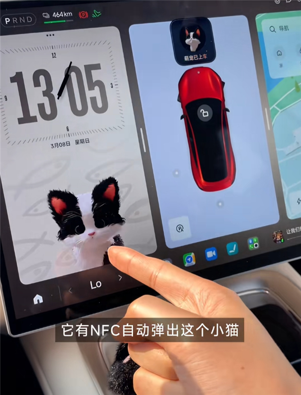 萌宠内部配备NFC芯片,只要放到主驾侧的无线充电面板上,车机屏幕就会自动弹出萌宠主题,同步播放动画和声音,情绪价值和仪式感直接拉满,相信没有几个女生能够拒绝这样的萌宠。