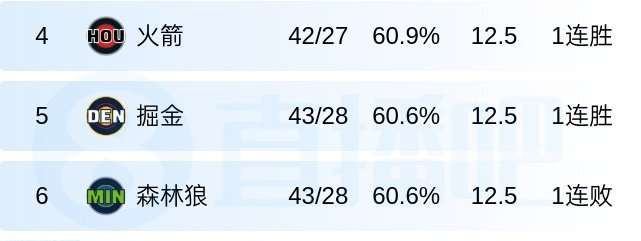 目前,火箭(42胜27负)、掘金(43胜28负)和森林狼(43胜28负)分列西部第四到第六,且胜场差相同,均落后第三的湖人2.5个胜场。