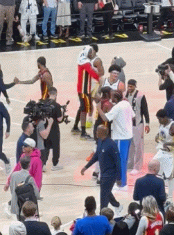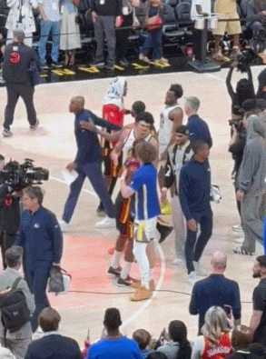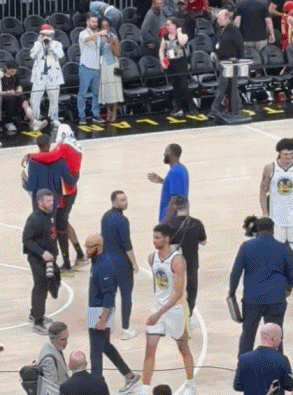 这是库明加被交易后首次面对老东家,赛后他和前队友拥抱致意,也和主教练科尔简单握手拥抱,最后还和库里聊了一会。
